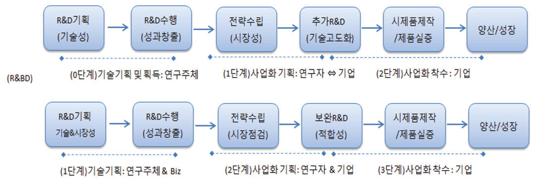 전통적인 R&D 기술이전 사업화 모델에 반해, R&BD 모델은 시장, 즉 기술의 수요 중심의 전개가 이루어진다고 볼 수 있